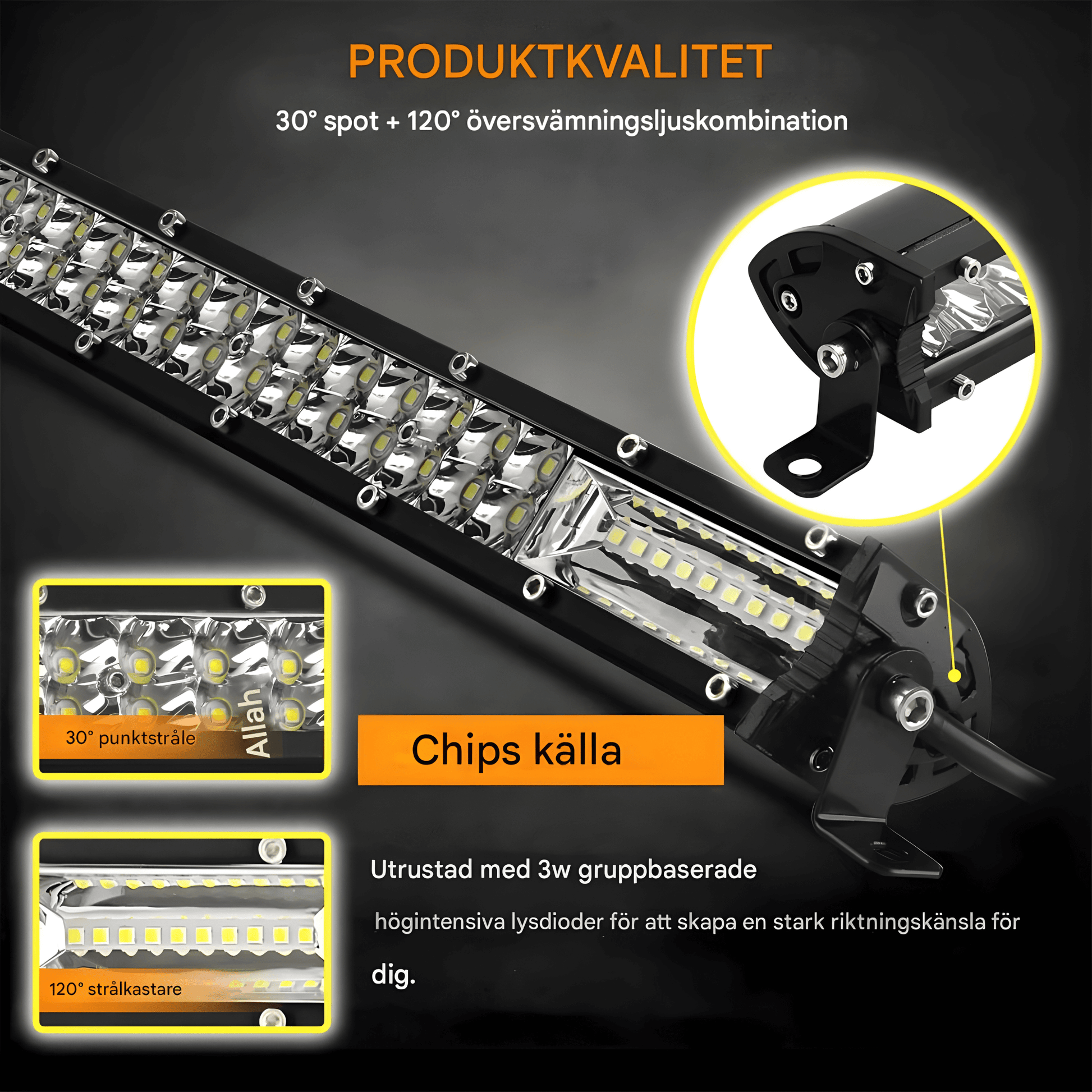 - Justerbara Monteringsfästen - Fästena kan vinklas för att ge rätt ljusvinkel beroende på fordon och monteringspunkt, exempelvis grill, stötfångare eller takräcke.